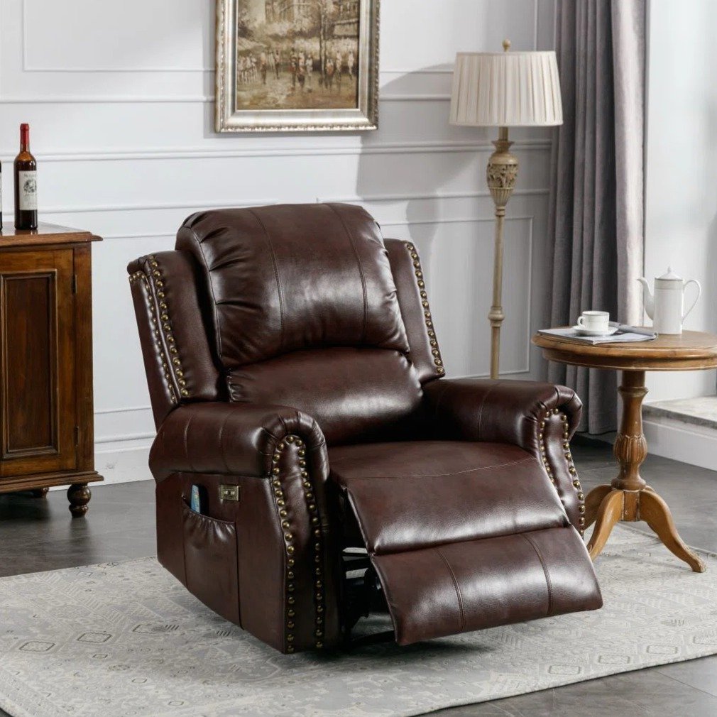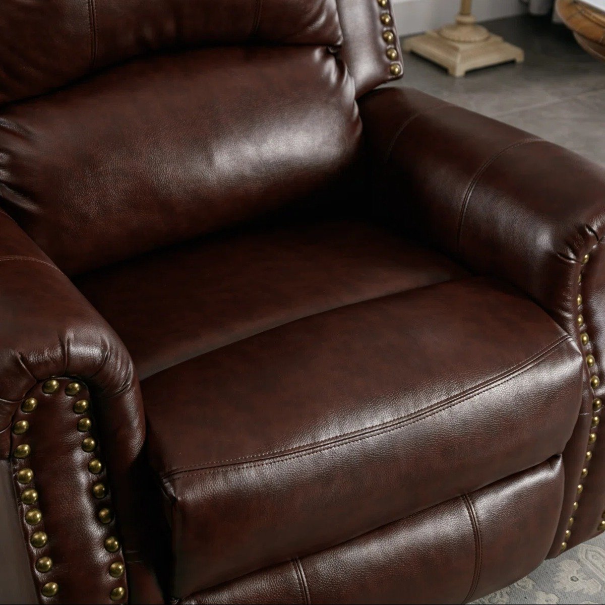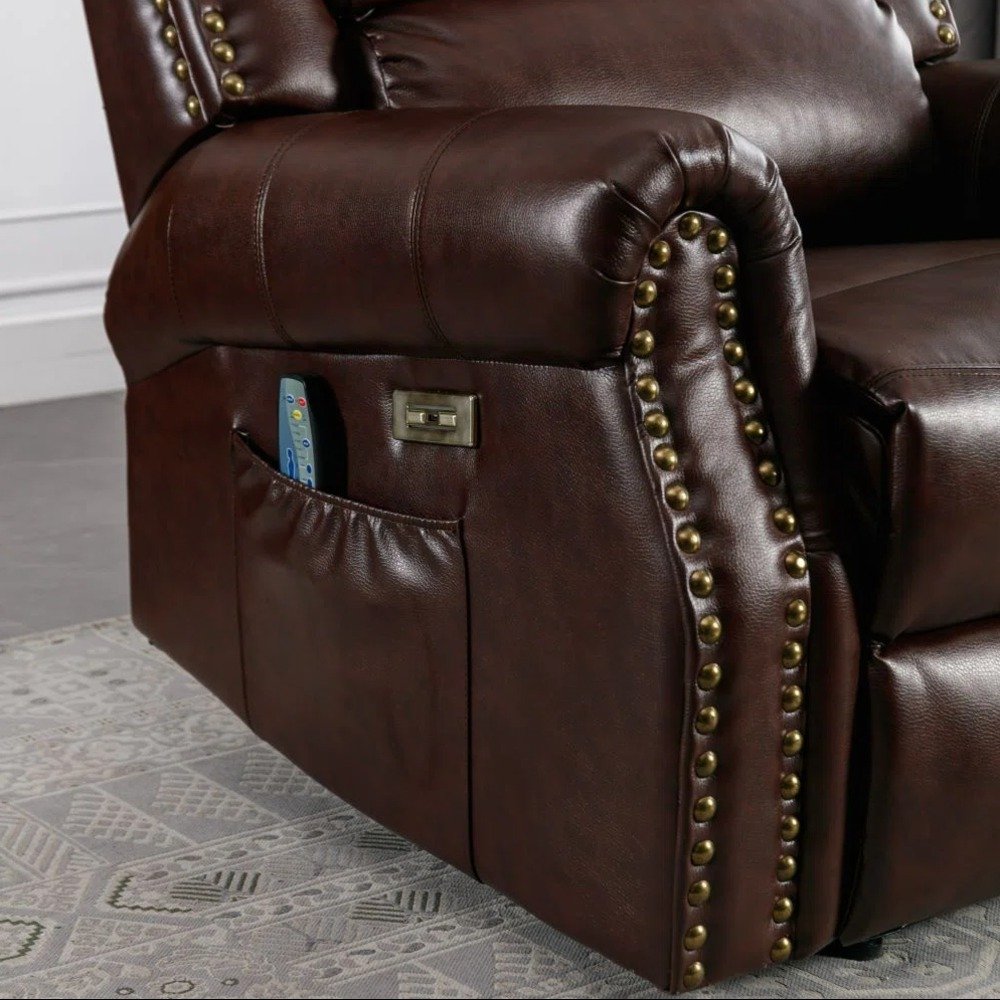 Upgrade your living space with the Maxwellton 38” Wide Power Recliner by Urban Recliner, a perfect balance of modern convenience and timeless design. Upholstered in smooth, easy-to-maintain faux leather and accented with elegant brass nailhead trim, this recliner adds a refined touch to any living room, lounge, or media space.