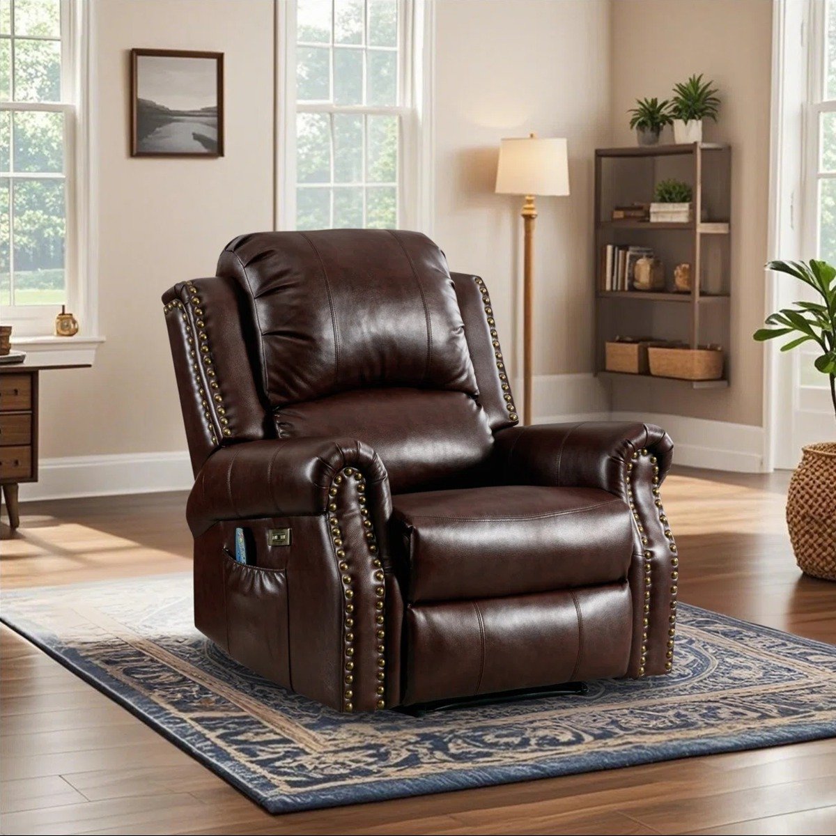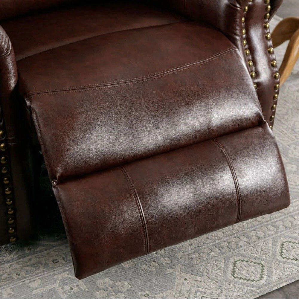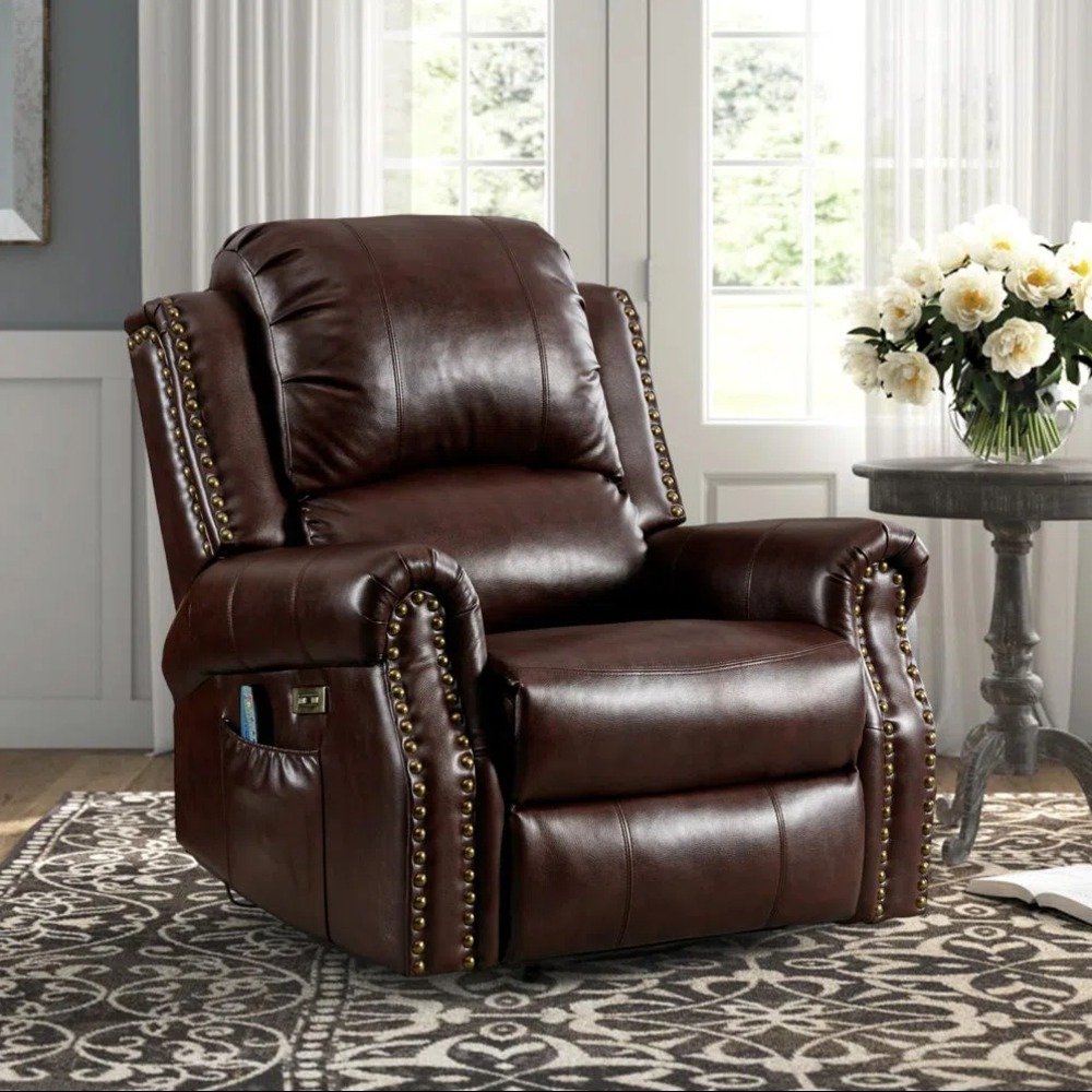 Upgrade your living space with the Maxwellton 38” Wide Power Recliner by Urban Recliner, a perfect balance of modern convenience and timeless design. Upholstered in smooth, easy-to-maintain faux leather and accented with elegant brass nailhead trim, this recliner adds a refined touch to any living room, lounge, or media space.